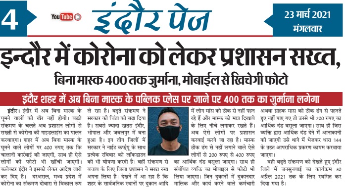 इंदौर शहर में अब बिना मास्क के पब्लिक प्लेस पर जाने पर 400 तक का जुर्माना लगेगा।