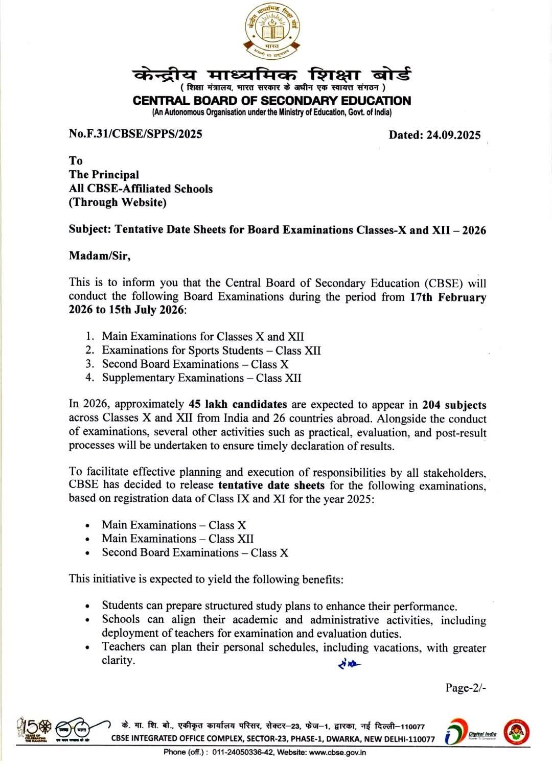 सीबीएसई ने जारी की 2026 की बोर्ड परीक्षाओं की संभावित तिथियां