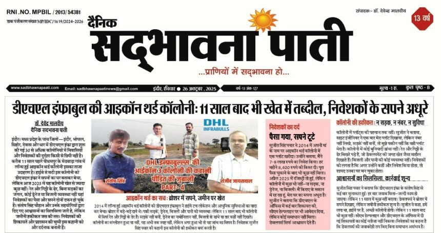 इंदौर। मध्य प्रदेश के पांच जिलों—इंदौर, भोपाल, सिहोर, देवास और धार में डीएचएल इंफ्रा द्वारा शुरू की गई 30 से अधिक कॉलोनियों में निवासियों और निवेशकों की दुर्दशा किसी से छिपी नहीं है। करीब 11 साल पहले पीथमपुर के मेठवाड़ा गांव में लॉन्च हुई आइकॉन थर्ड कॉलोनी इसका ताजा उदाहरण है। हाईवे से सटी इस कॉलोनी को डीएचएल इंफ्रा ने सपनों का घर बताकर बेचा, लेकिन आज 2025 में यह कॉलोनी खेत से ज्यादा कुछ नहीं। रेत और गिट्टी के ढेर, बिना सड़कों का जंगल, कोई ड्रेनेज या बिजली व्यवस्था नहीं यहां निवेशकों का पैसा और सपने दोनों दफन हो चुके हैं। संतोष सिंह चौहान और उनके सहयोगियों द्वारा दिए गए आश्वासनों का सिलसिला जारी है, लेकिन जमीनी हकीकत जस की तस। निवेशकों की शिकायतें और प्रशासन की चुप्पी इस कहानी को और दर्दनाक बनाती हैं।