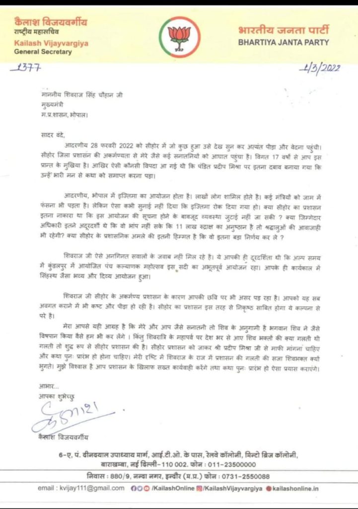 कैलाश विजयवर्गीय ने शिवराज को लिखे पत्र में कहा है कि सोमवार की घटना से अत्यंत पीड़ा और वेदना पहुंची है। सीहोर प्रशासन की अकर्मण्यता से मेरे जैसे कई सनातनियों को आघात पहुंचा है।