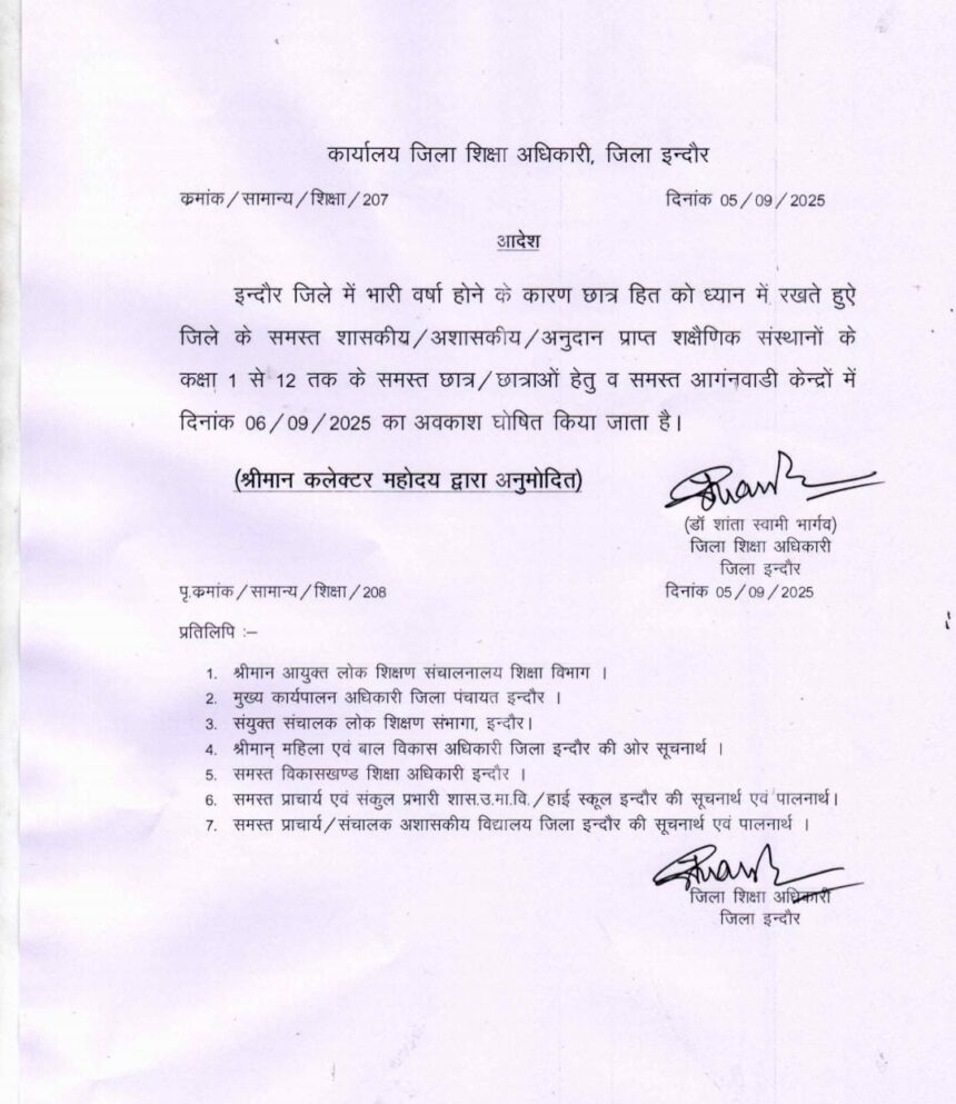 इंदौर। लगातार हो रही भारी बारिश के चलते जिला प्रशासन ने विद्यार्थियों की सुरक्षा को ध्यान में रखते हुए शनिवार, 6 सितंबर 2025 को जिलेभर के सभी स्कूलों और आंगनवाड़ियों में अवकाश घोषित कर दिया है।