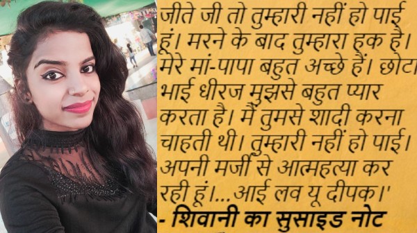 उसे पास के अस्पताल लेकर गए लेकन डॉक्टरों ने मृत घोषित कर दिया। पुलिस को सूचना मिली तो मौके पर पहुंची। जिस कमरे में शिवानी ने आत्महत्या की वहां से सुसाइड नोट मिला। इसमें लिखा था कि ‘अपनी मर्जी से आत्महत्या कर रही हूं। आई लव यू दीपक। जीते जी तो तुम्हारी नहीं हो पाई हूं।