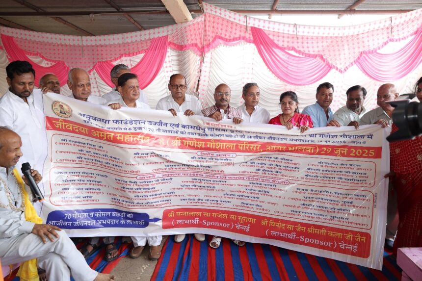 कोटा-इंदौर हाईवे के समीप पिपलोन क्षेत्र से प्रशासनिक अनुमति प्राप्त कर दिनांक 29 जून 2025 को पुनः पिपलोन क्षेत्र से 5 ट्रकों में 70 गौमाताएं व 12 बछड़ों को श्री गणेश गौशाला, आगर मालवा में संजीवनी आश्रय मिला। अनुकंपा फाउंडेशन के राष्ट्रीय अध्यक्ष जीव दया प्रेमी कालूलाल सालेचा भवानी मंडी, अनुकंपा फाउंडेशन के राष्ट्रीय मार्गदर्शक मोहनलाल मेहतारावटी, राष्ट्रीय सहसचिव भूपत खंडेलवाल मुंबई, संस्था के राष्ट्रीय संरक्षक प्रदीप भाचावत उज्जैन, राष्ट्रीय सह सचिव एवं प्रदेश अध्यक्ष मध्य प्रदेश संजय जैन फुलेरा पिपलोन कला। कामधेनु गौ सेवा ट्रस्ट की ऑल इंडिया डायरेक्टर श्रीमती शारदा जवाहर चौधरी (बेंगलुरु), राजस्थान प्रदेश अध्यक्ष श्रीमती संगीता मोदी जोधपुर, प्रदेश मंत्री श्रीमती संगीता भंडारी जोधपुर तथा मालवा शाखा की पूर्व अध्यक्ष श्रीमती संगीता चौधरी आगर ने अपनी गरिमामयी उपस्थिति देकर सेवा कार्य की सराहना की।