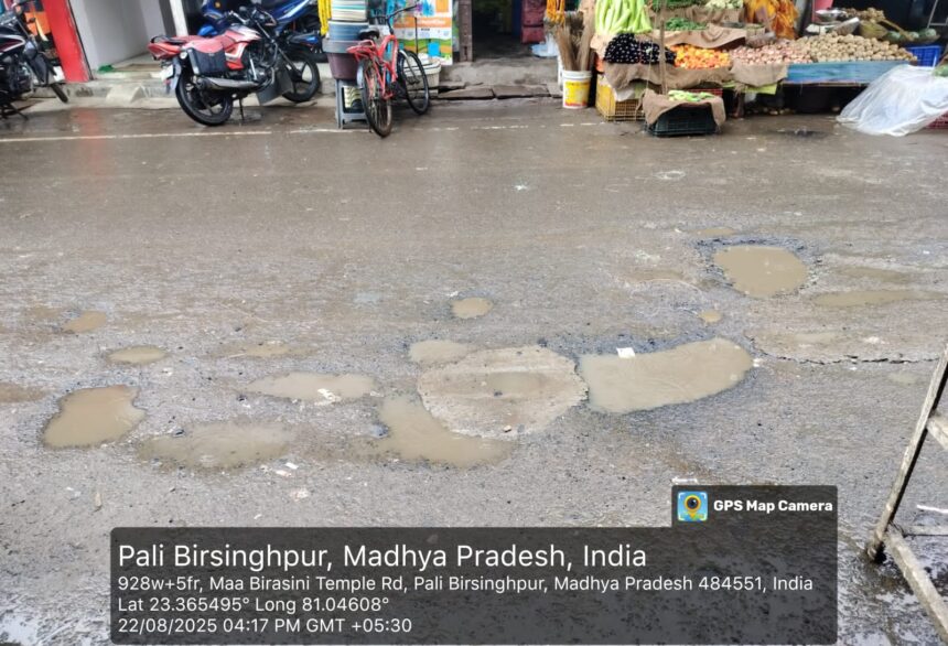 पाली बिर्सिंहपुर। नगर के प्रमुख धार्मिक स्थल माता बिरासनी मंदिर तक जाने वाला मुख्य मार्ग गड्ढों और जलभराव से पूरी तरह बदहाल हो चुका है। सड़क की दुर्दशा से न केवल स्थानीय नागरिक बल्कि दूर-दराज़ से आने वाले श्रद्धालु भी परेशान हैं। भक्तों का कहना है कि मंदिर पहुँचने के रास्ते में वार्ड 11 में संजय किराना स्टोर से लाइफ केअर मेडिकल स्टोर तक, सब्जी बाज़ार के सामने बड़े-बड़े गड्ढों और कीचड़ के कारण पैदल चलना और वाहन निकालना मुश्किल हो गया है। कई श्रद्धालुओं ने मुख्यमंत्री हेल्पलाइन पर शिकायत दर्ज कर मुख्यमंत्री से सीधे हस्तक्षेप की गुहार लगाई है।