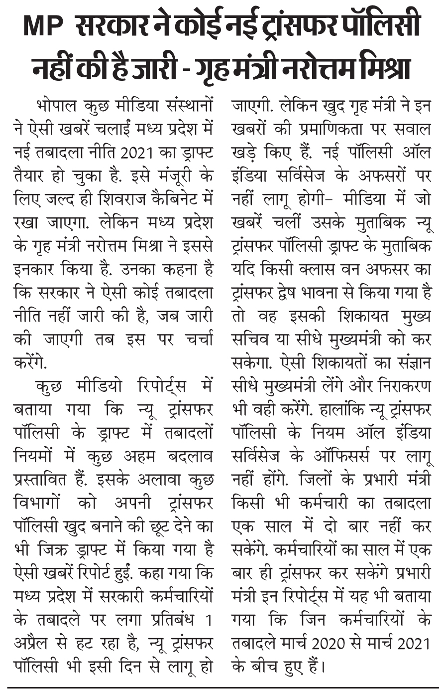 कुछ मीडियो रिपोर्ट्स में बताया गया कि न्यू ट्रांसफर पॉलिसी के ड्राफ्ट में तबादलों नियमों में कुछ अहम बदलाव प्रस्तावित हैं. इसके अलावा कुछ विभागों को अपनी ट्रांसफर पॉलिसी खुद बनाने की छूट देने का भी जिक्र ड्राफ्ट में किया गया है ऐसी खबरें रिपोर्ट हुईं. कहा गया कि मध्य प्रदेश में सरकारी कर्मचारियों के तबादले पर लगा प्रतिबंध 1 अप्रैल से हट रहा है, न्यू ट्रांसफर पॉलिसी भी इसी दिन से लागू हो जाएगी. लेकिन खुद गृह मंत्री ने इन खबरों की प्रमाणिकता पर सवाल खड़े किए हैं.