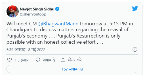 जिसके बाद कहा जा रहा है कि नवजोत सिंह सिद्धू एक बार फिर पाला बदल सकते हैं. इसी बीच अब सिद्धू सोमवार 9 मई को पंजाब के सीएम भगवंत मान से मुलाकात करने जा रहे हैं. उन्होंने खुद ट्विटर पर इस बात की जानकारी दी है.