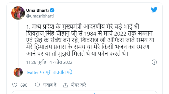 शराब बंदी पर उनसे हुई दो बार की मुलाकात भी याद दिलाई। मगर भारती के ट्वीट में इस बात के संकेत दिखाई देते हैं कि वे दुखी हैं कि शिवराज सिंह चौहान ने उनसे बात नहीं की और शराब बंदी पर उन्होंने बात कह दी। भारती को यह भी दुख है कि वे मीडिया के माध्यम से बात कर रहे हैं।